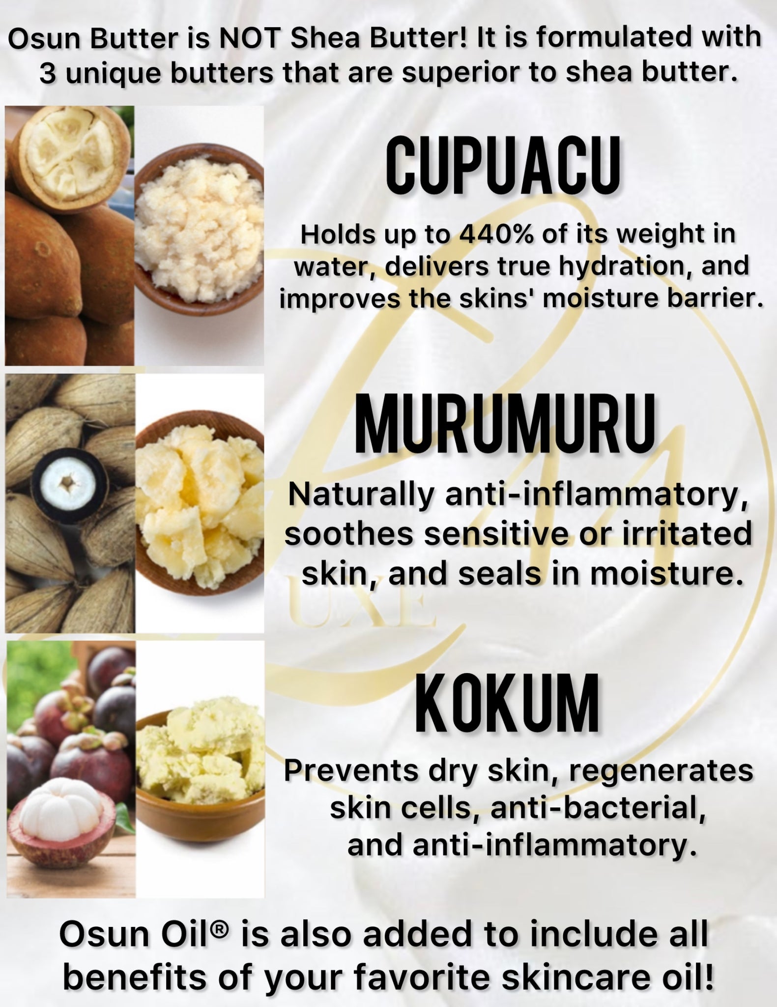 Most body butters on the market are made with shea butter. Osun Butter is far more superior. It includes 3 rare exotic butters and 5 high quality luxe oils.